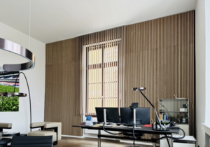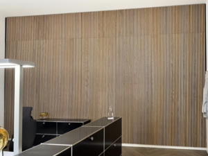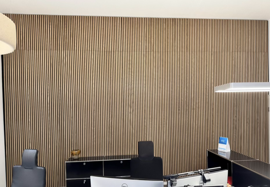 Das Ergebnis: Eine hochwertige Wandverkleidung aus Eichenholzlamellen, natur furniert und geölt, kombiniert mit einem schallabsorbierenden Vlies im Hintergrund.