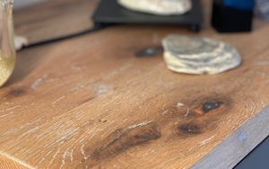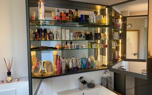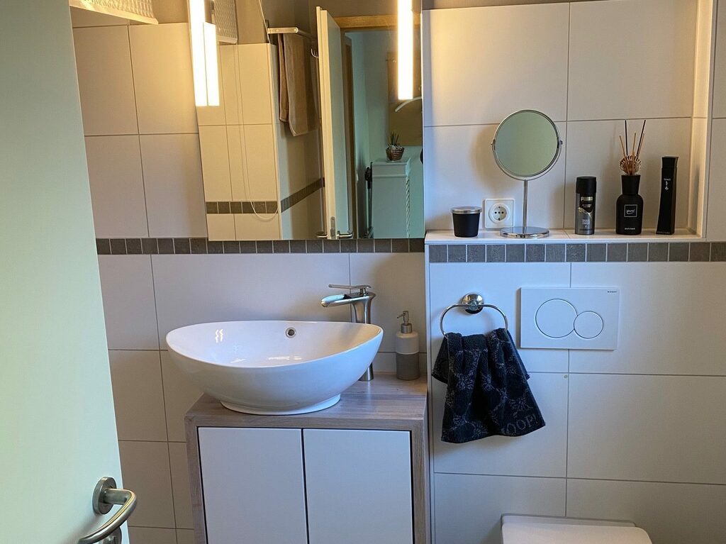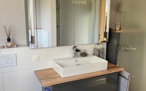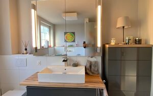 Ein Spiegelschrank mit optimaler Beleuchtung von der Seite, der zusätzlich auch von innen verspiegelt ist, (Rückseite der Türen und Rückwand) und beleuchtet, sodass man sich von allen Seiten gut betrachten kann. Der Schubladenschrank rechts, mit drei Schüben und einer Klappe und hochglanz-lackierter Front, wurde passend zu dem Ikea-Waschtisch-Unterschrank lackiert. Die Deckblätter sind jeweils aus rustikaler Eiche hergestellt, welche in diesem Fall sorgfältig stumpfmatt mit hochwertigem 2-k Acryllack geschützt wurden.