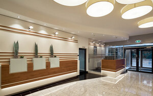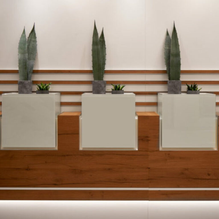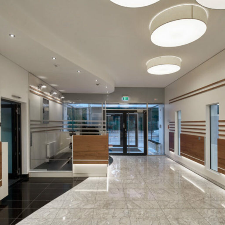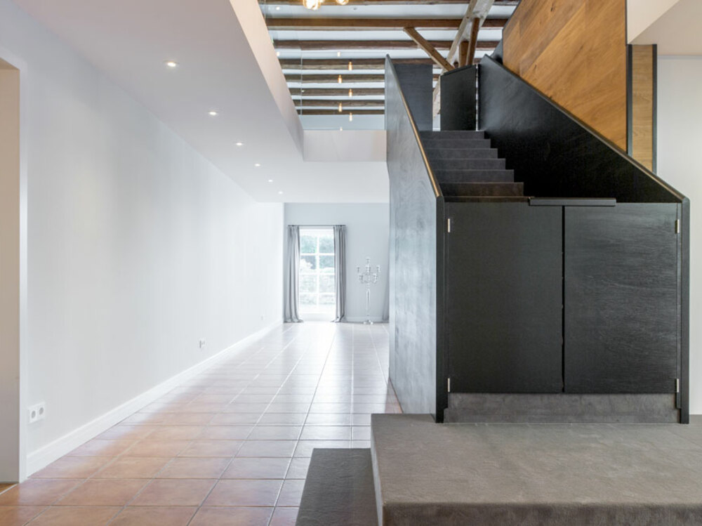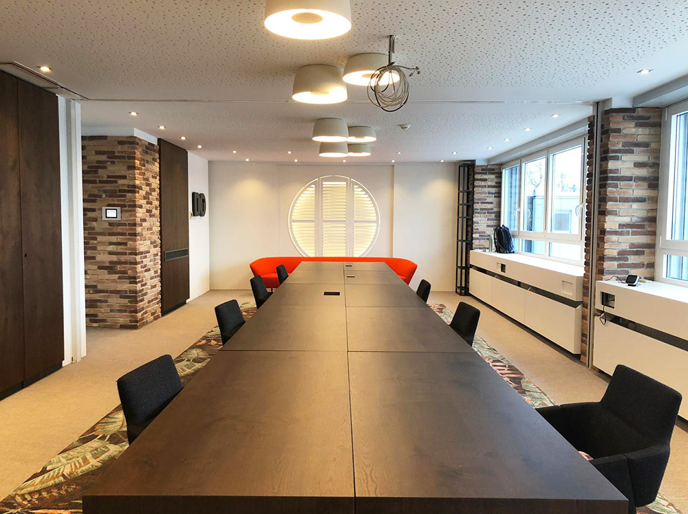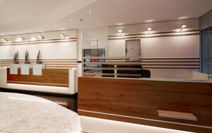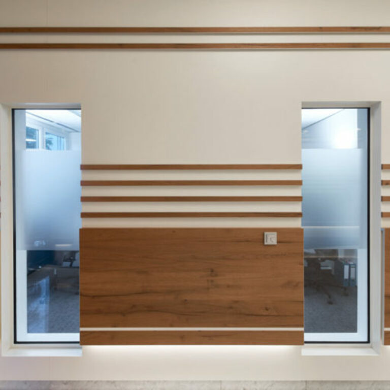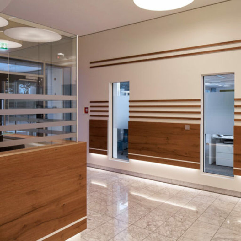Dieser Tresen, komplett aus unbrennbarem Material, dennoch mit teilweise Eiche-furnierter Front wurde, inkl. Podest und abgestimmten Wandverkleidung, nach Entwürfen der Innenarchitektin umgesetzt.