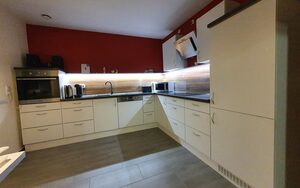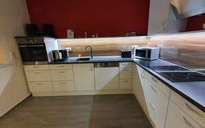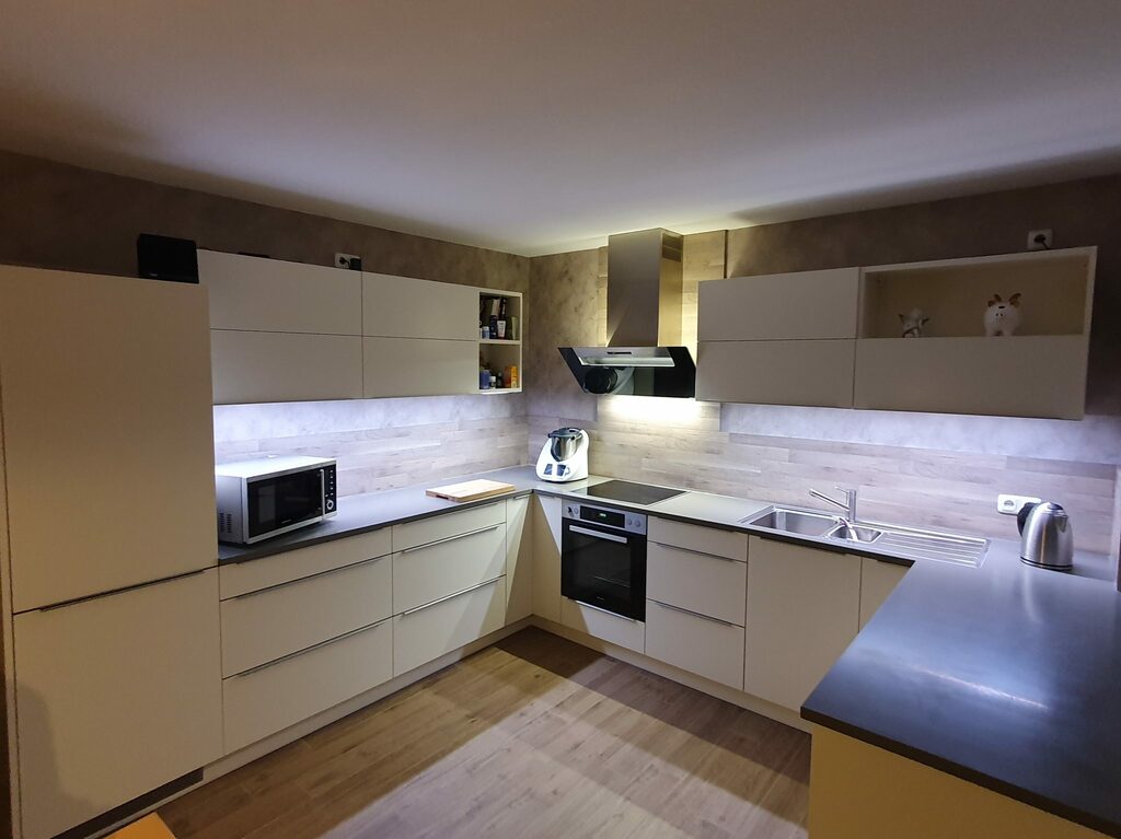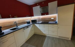 Diese Küche wurde komplett renoviert und alle Küchenmöbel, sowie die Arbeitsplatte individuell, abgestimmt neu hergestellt. Hier in Verbindung mit einer Arbeitsplatte aus dem Holzhandel, welche durch das Team der Tischlerei Brand konfektioniert wurde.