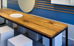 Dieses Bild zeigt einen Massivholztisch aus rustikaler Eiche mit drei einzelnen, auf einem Stahlgestell verschraubten , gehobelten, geschliffenen und naturgeölten oder lackierten Eichenbohlen.